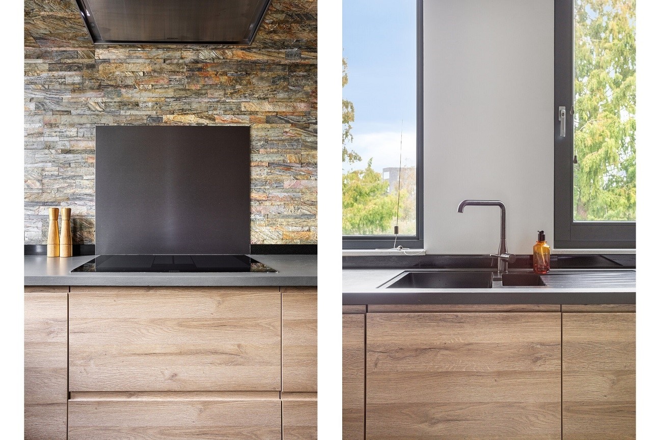 Entree, hal garderobe, meterkast, ruim zwevend toilet, living met openslaande deuren naar de achtertuin, georiënteerd op het zuidwesten. • De complete keuken in houtachtige kleurstelling aan de voorzijde van de woning is voorzien van koelkast, vriezer, vaatwasmachine, oven, magnetron, 4 pits-gasfornuis en afzuigkap, • De gehele benedenverdieping is voorzien van een prachtige binnendeuren en een PVC vloer met een 5 groepen vloerverwarming. • Dichte trap naar de 1e verdieping, met trapkast voorraadkast.