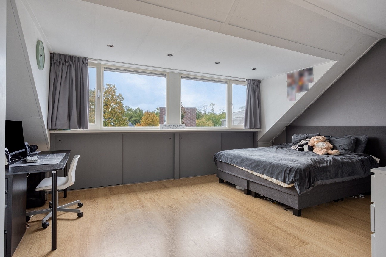Gehele tweede verdieping is voorzien van dezelfde kwalitatieve hoogwaardige laminaat vloer. Deze verdieping is voorzien van een ruime open zolderkamer en de ruime 4e slaapkamer. • Voorzolder: open (studeer/hobby/werk) kamer met dakkapel aan de voorzijde, voorzien van CV en opstelling voor wasmachine en droger. Ook is hier een grote vliering via een vlizotrap bereikbaar. • Achterzijde: ruime 4e slaapkamer met groot dakkapel over de gehele breedte van de woning.