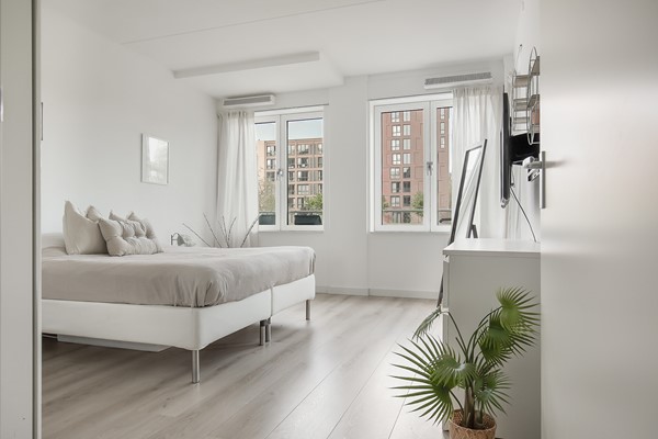 Stap binnen in de ruime, netjes afgewerkte hal. Het appartement beschikt over een apart toilet. De ruime master bedroom biedt een prachtig uitzicht op een water, terwijl de tweede slaapkamer gezellig is en toegang heeft tot het balkon. De fraaie badkamer is efficiënt ingericht. De woonkamer, met grote ramen en een fijn balkon, creëert een sfeer van ruimte en sereniteit. De open keuken, uitgerust met luxe inbouwapparatuur, maakt koken tot een feestje. Bij binnenkomst vallen direct de hoge plafonds op. De plafonds op de begane grond zijn een stuk hoger dan alle andere appartementen die zich niet op de begane grond bevinden.