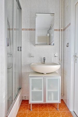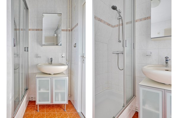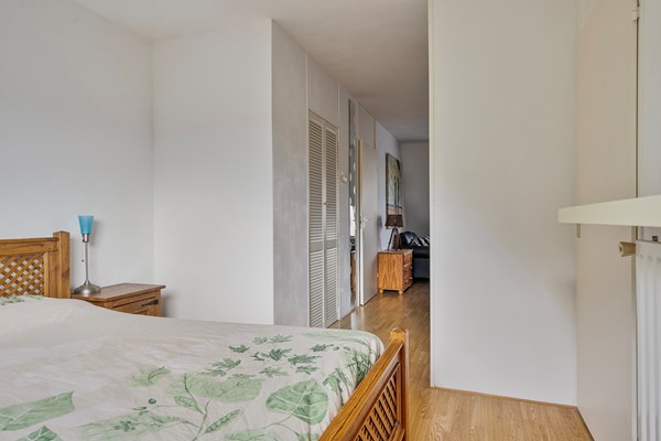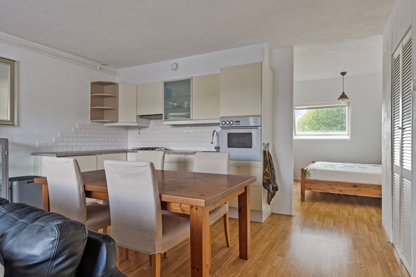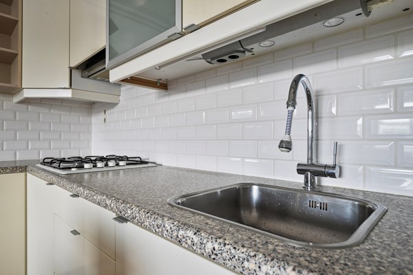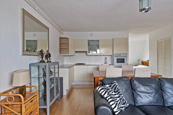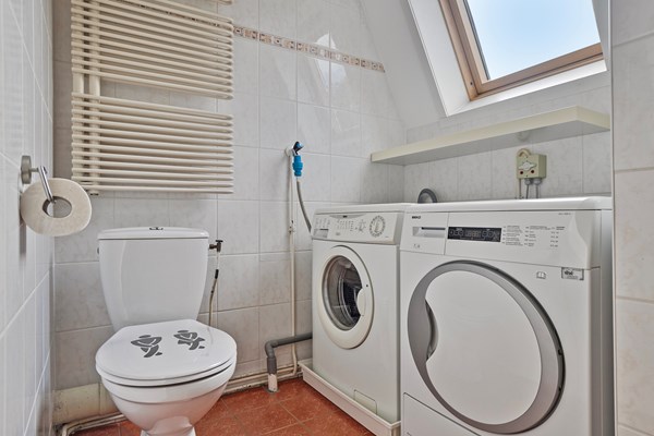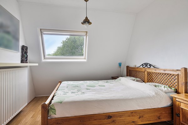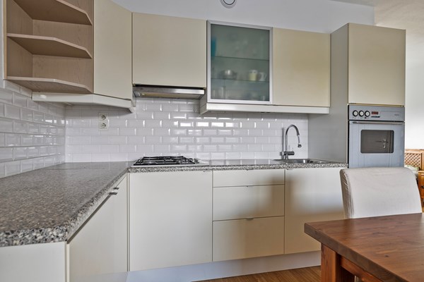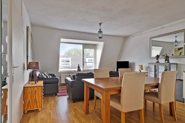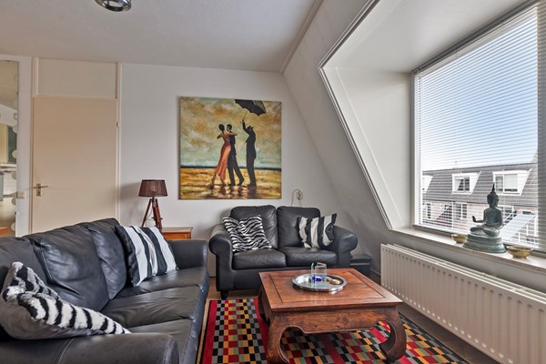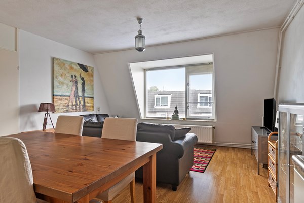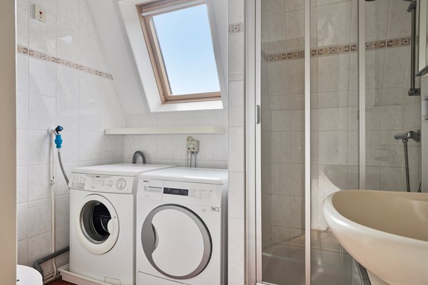 Op de tweede verdieping bevindt zich een lichte woonkamer, voorzien van een laminaatvloer en een dakkapel. De open keuken is uitgerust met inbouwapparatuur, waaronder een koelkast, combimagnetron, vierpits gasfornuis en afzuigkap. De slaapkamer heeft een groot Velux dakraam met veel lichtinval en een ruime inloopkast. Verder is er een tussenhal met kast, CV-ruimte met een gehuurde CV-ketel (€ 18,50 per maand incl. onderhoud) en een badkamer met Velux dakraam, douche, toilet, wastafelmeubel en aansluiting voor een wasmachine en droger.